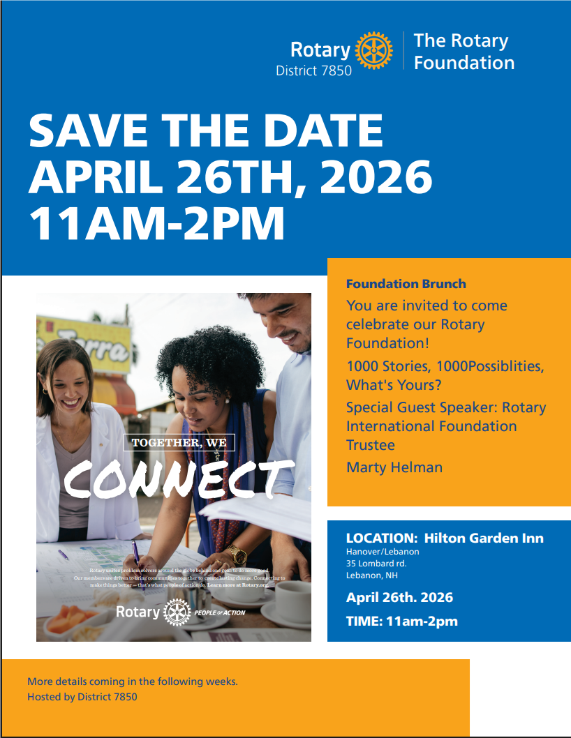 SAVE THE DATERotary District 7850 Foundation Brunch Sunday, April 26, 2026 Time: 11:00am – 2:00pm