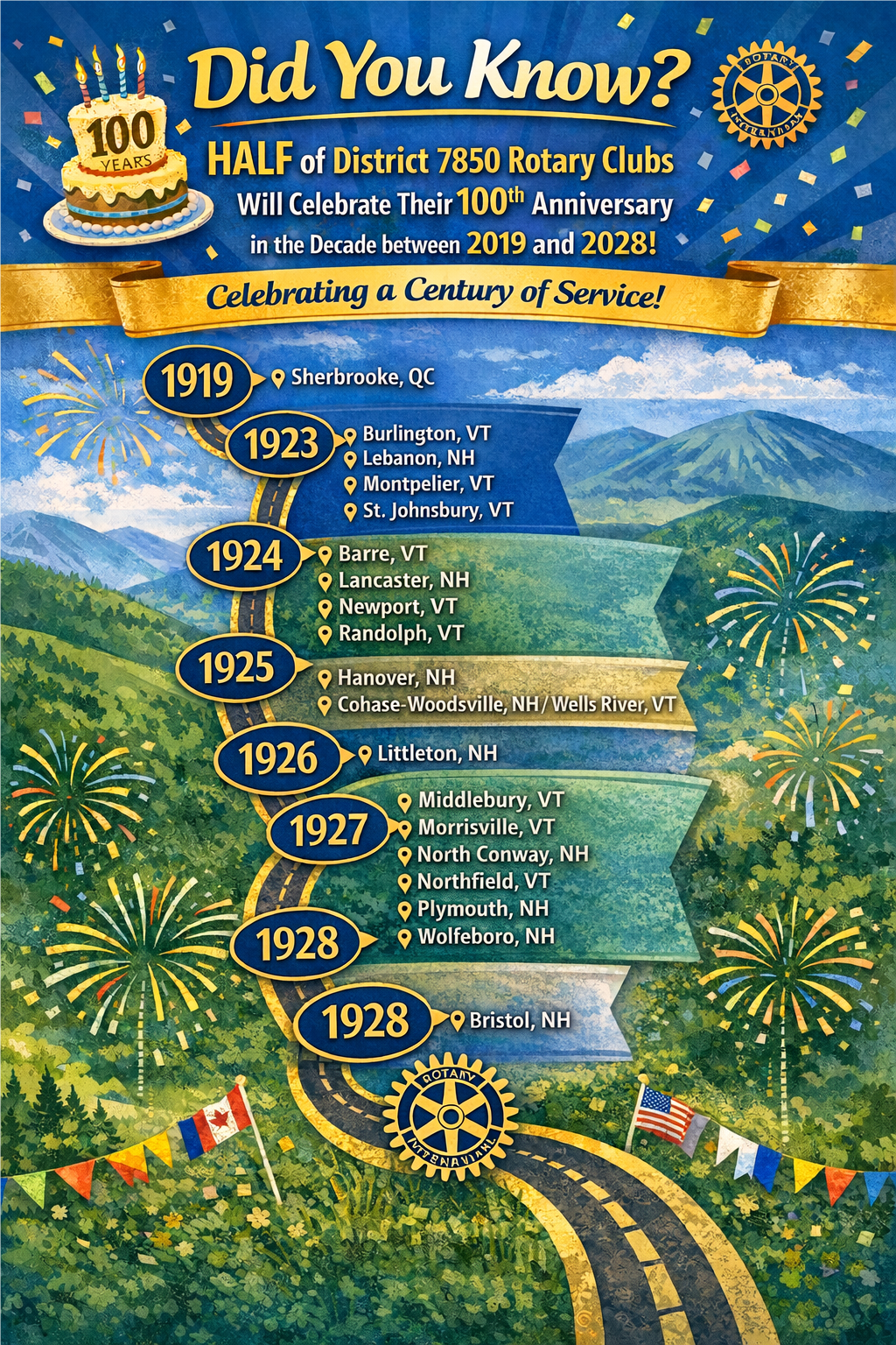 Correction – in last week’s newsletter there was an embarrassing omission - St. Albans Rotary Club wasn’t listed among club’s celebrating 100th anniversaries! 2024 marked their 100th year! That makes 20 clubs in the district achieving that goal in the past decade. As Joe Halko wrote, “Imagine the amazing number of hours of community service that represents.”