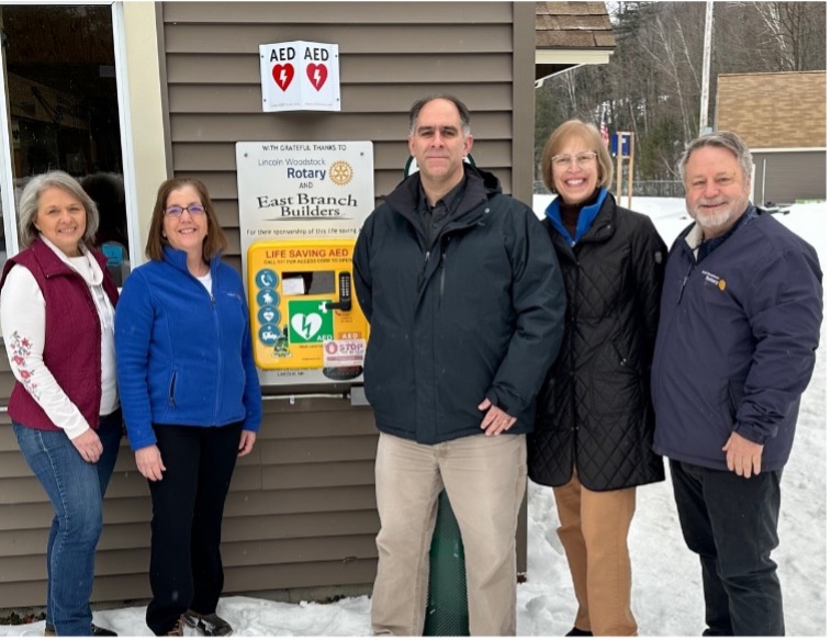 Speaking of Heros, the Rotary Club of Lincoln-Woodstock worked with the Lin-Wood Ambulance and other local businesses to supplement a district grant which purchased and updated AED (Automated External Defibrillator) boxes throughout the two towns. Show to the left are Lynne Warren (Immediate Past President), Debbie O’Connor (Board member), Stuart Anderson (Executive Secretary), Connie Chesebrough (Grants & Membership Committee), and Jerry Stringham (Club President).