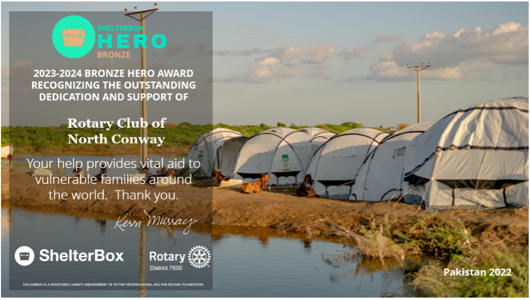 We have Shelter Box Heros in our midst! Congratulations to the North Conway Rotary Club for their 2023-2024 recognition. At the end of this year, all HERO clubs will be listed at www.shelterboxusa.org/hero. Over 325,000 people were supported through Shelter Box in 2023. Turkey, Syria, Morocco when earthquakes struck and East Africa through the drought are just some of the places where Shelter Box stepped in. Here are two short videos to watch at your next meeting and share on social media: