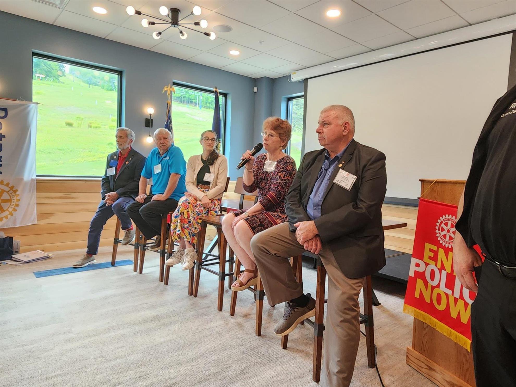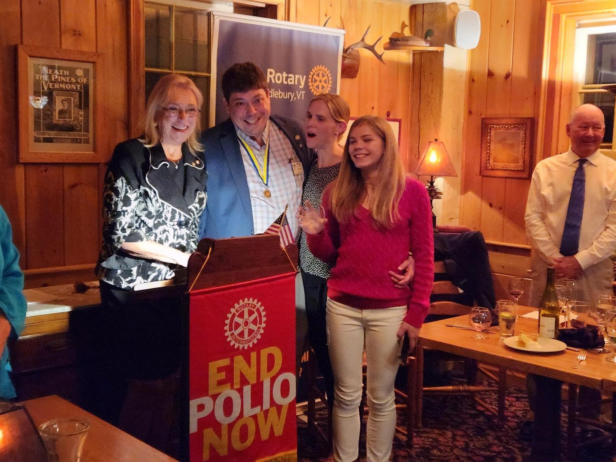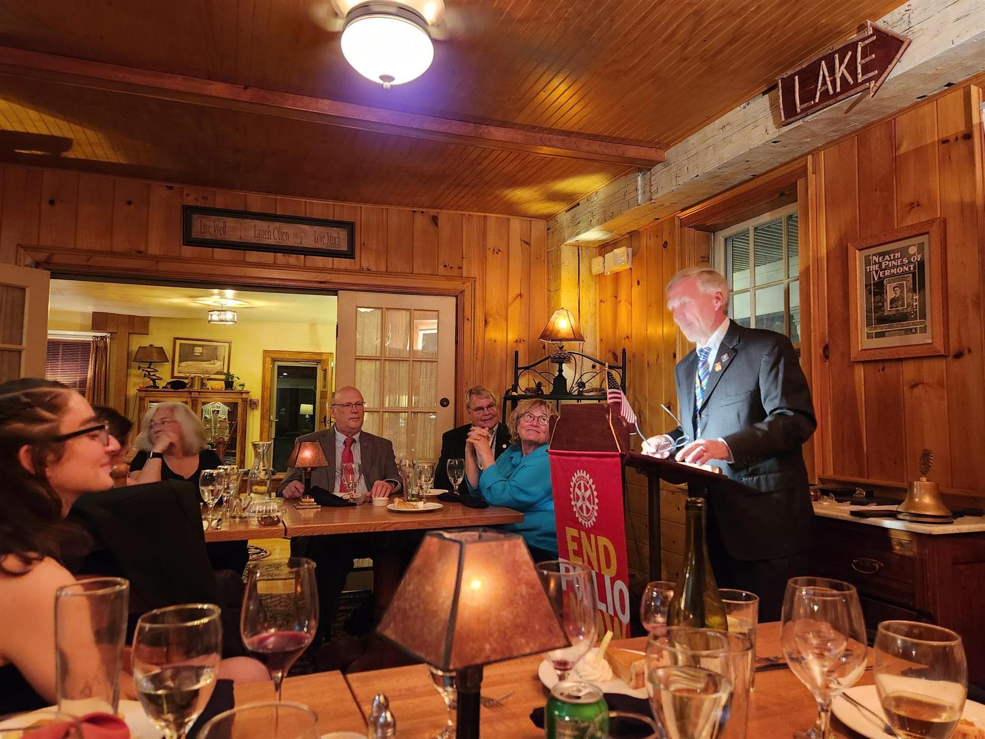 Ceci a été suivi par un discours rempli de faits et d'anecdotes prononcé par le président du comité Polio du RI, Mike McGovern. Il nous a dit qu'aujourd'hui encore, des gens risquent leur vie (deux décès récents) pour administrer les vaccins/gouttes contre la polio. C'est une pensée qui donne à réfléchir d'apprendre que ces personnes courageuses se soucient de la situation et sont prêtes à prendre ces risques pour sauver des enfants de cette terrible maladie. Cela dit, il nous a ensuite encouragés en nous faisant part des progrès réalisés dans plusieurs domaines. Étonnamment, nous avons découvert que le Pakistan et l’Afghanistan ne sont pas les régions qui comptent le plus grand nombre de cas de polio… loin de là. On aurait pu écouter Mike toute la journée, mais il a dû retourner à sa propre conférence qui se tenait aussi le même jour dans le sud du Maine.